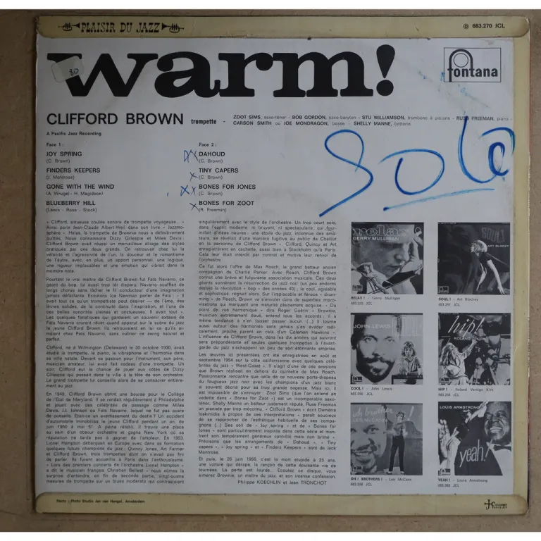 Hard bop classic recorded with Zoot Sims, Shelly Manne & many others. Sleeve has some dirt & aging, large writings on back, record has cloudy pressing hiss but is in pretty nice shape.