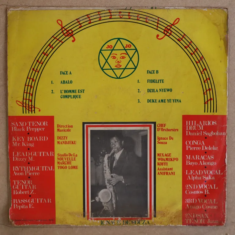 An african salsa tune and several soukous tracks all directed by Congolese guitarist Dizzy Mandjeku as recorded by the Benin group. Dirt wear & aging on cover, narrow bite on bottom mouth & seam, 2,5" split on bottom, peel off on front, light brown water damage wear on A side label & top spine corner, record has constant reasonable to light noise from marks.