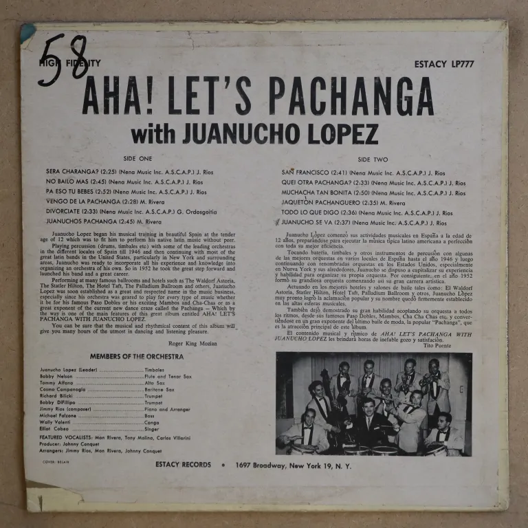 Pachangas & mambos on this solid lp, sleeve has some aging/dirt, 3" split on top, writings & peel off on back. Record plays with light constant pressing noise & some occasional noise from marks, very solid VG- to VG.