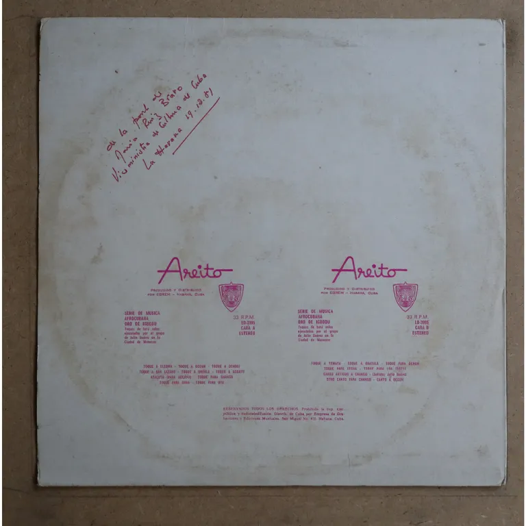 Afro Cuban percussion & voice piece specially reissued on limited 1000 copies edition as a Varadero pre festival gift to visitors. Hardly shows up in this precious version. Sleeve has a bit of dirt, autographed by Cuba's culture vice minister on back. record has very reasonable to hardly noticeable noise from marks, ranging from VG- to solid VG, worse part being second half of B1 & most B2 which have a deeper mark causing light clicks for about 2:30 minutes
