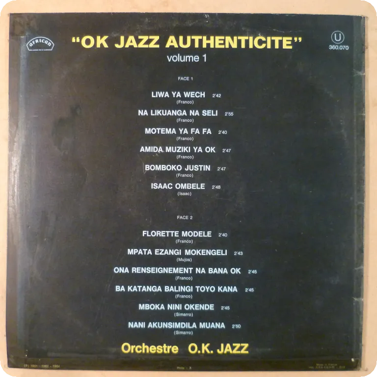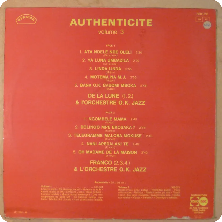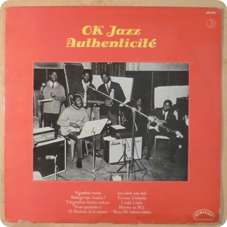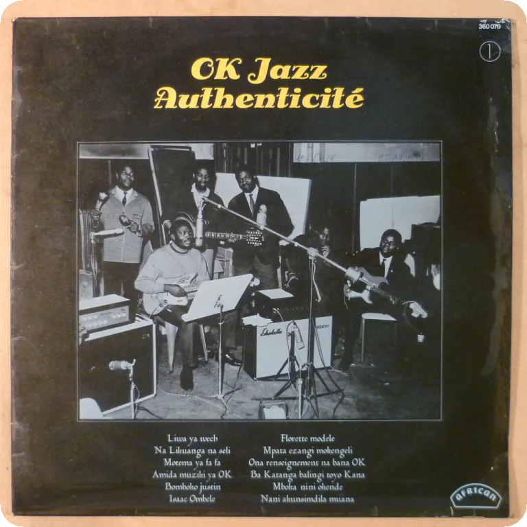 A killer deep bolero & Congolese style cha cha chas among multiple excellent rumbas by the legendary group. Some wear on cover, minor noise from light marks in parts,