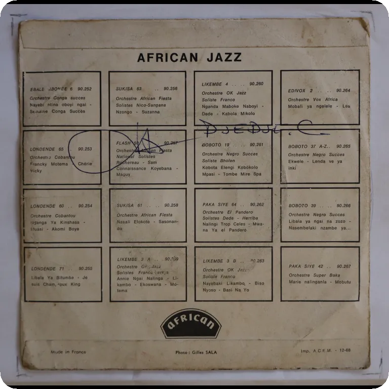 A deep bolero sung in both French & lingala & a rumba on this scrace release by the Congo guitar legend and his group. Sleeve has aging & dirt, peel off on front, writings on cover & labels, record has light to hardly noticeable noise, solid VG- to VG.