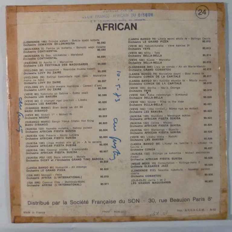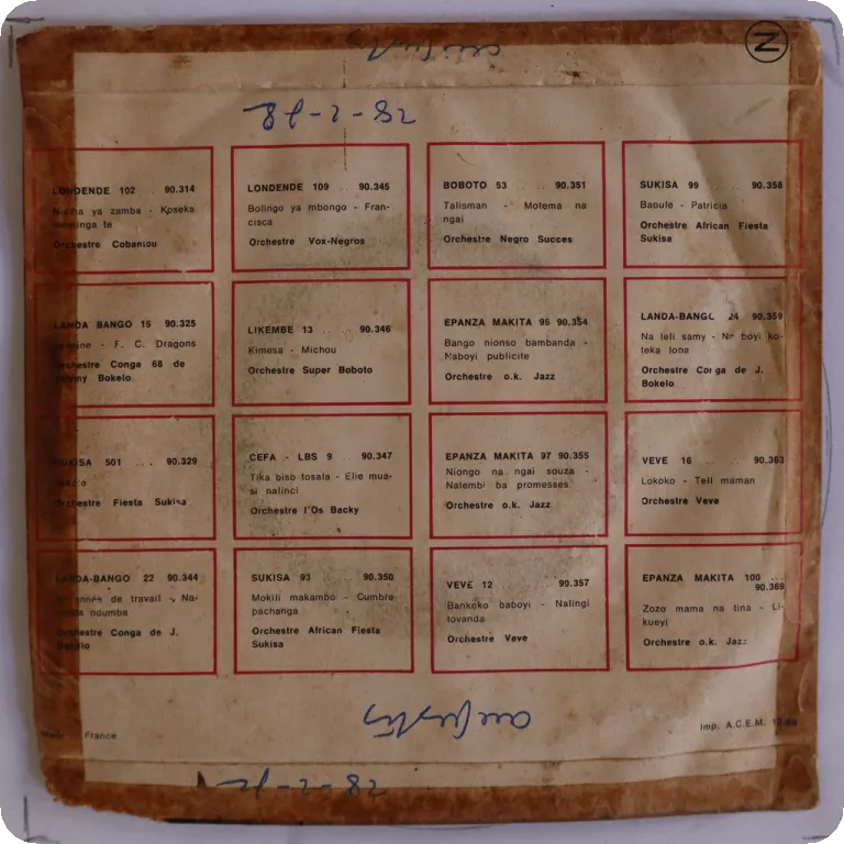 A cha cha cha and a rumba out of Congo, sleeve has aging & dirt, transparent tape along all seams & mouth, writings on cover & labels, A side's cha cha cha is noisy from poor condition record used for mastering as its obviously been recorded much earlier than 1972, otherwise record's solid VG-.