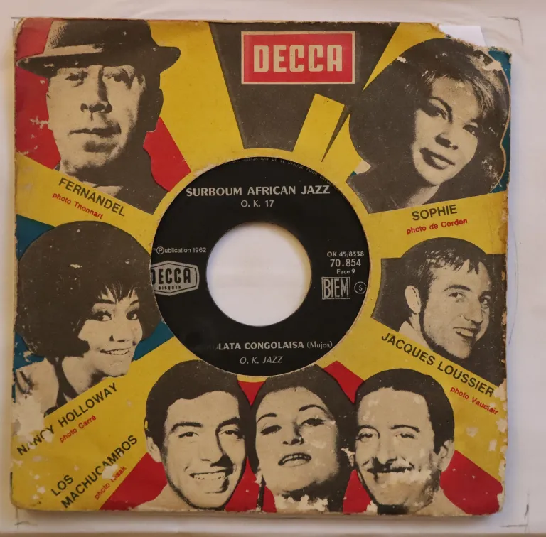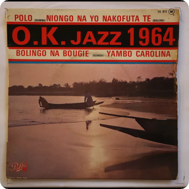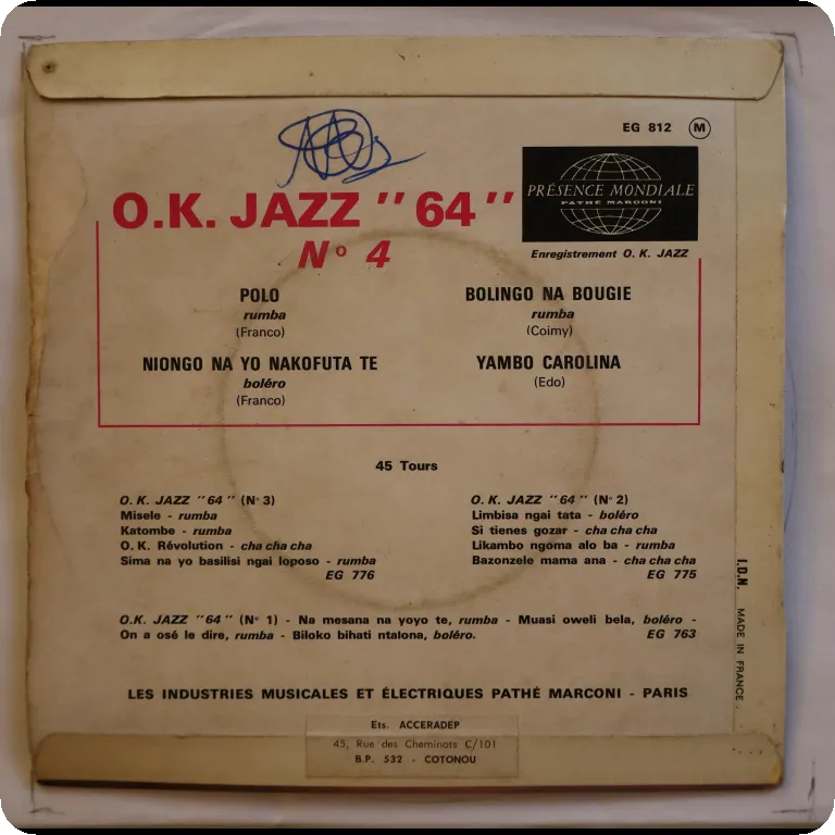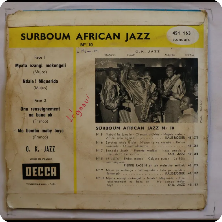 A hard hitting cha cha cha Congolese style & a rumba on this scarce OK Jazz release. Sleeve has strong wear, writings on back, peel off on front, bite on top mouth corner, record plays VG- to VG w/ reasonable to very light noise from marks.
