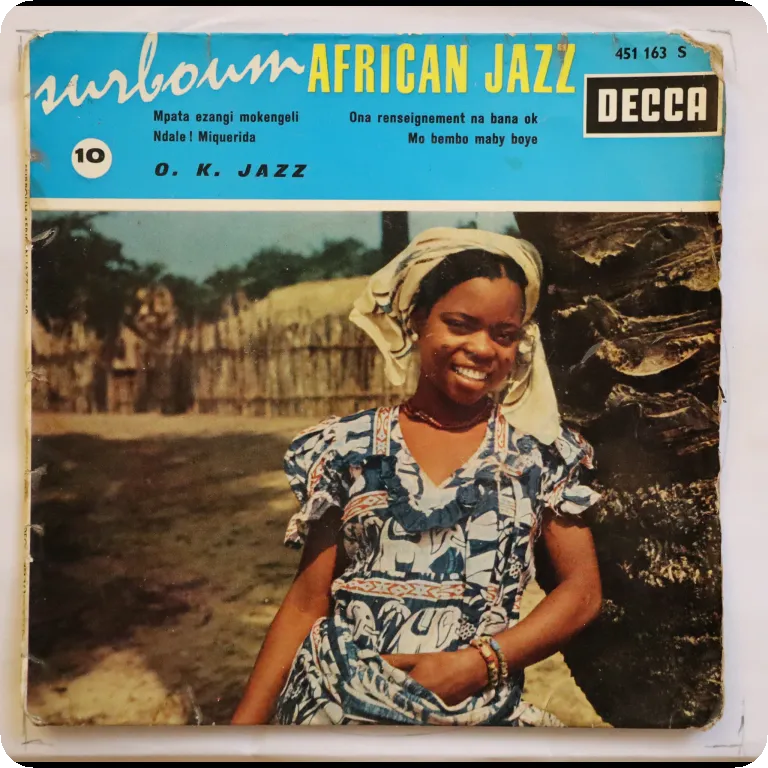 Swinging rumba & Cuban inspired Congolese cha cha cha, sleeve has strong dirt & aging, bites on spine & top mouth corner, some peel off on cover & labels, plays very solid VG- to VG/VG+ w/ light to