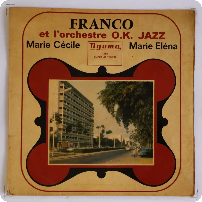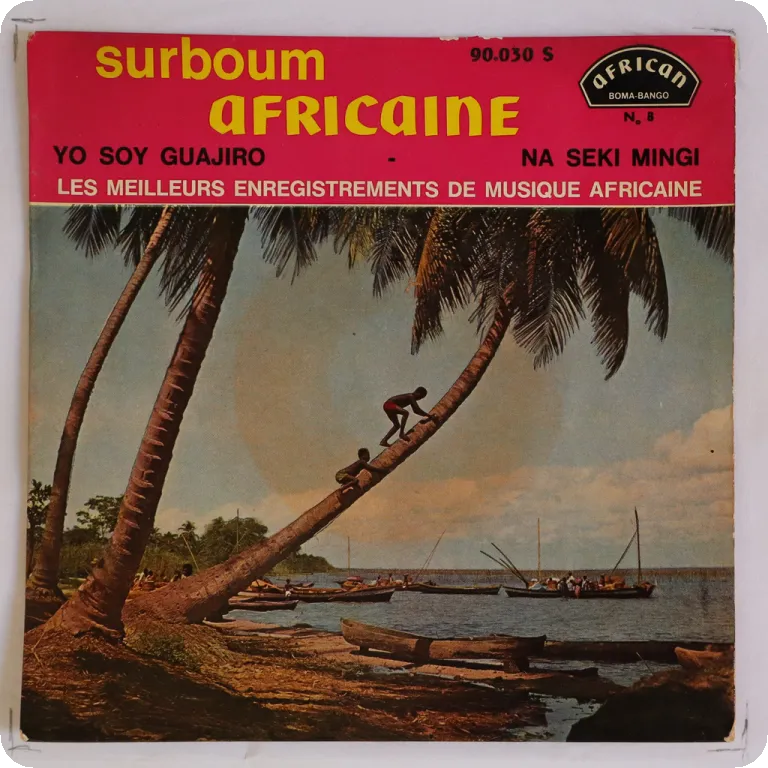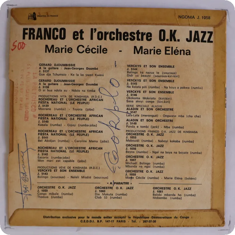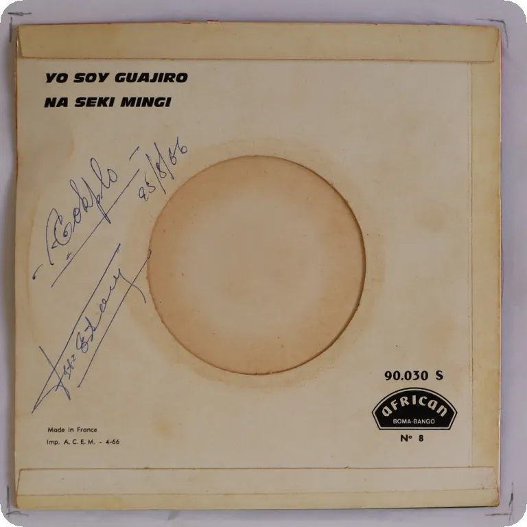 Sweet bolero with sax & guitar solos & a rumba on this scarce release by the legendary Congolese group, sleeve with aging & dirt, writings on labels, shop stamp on back, record has reasonable to light noise