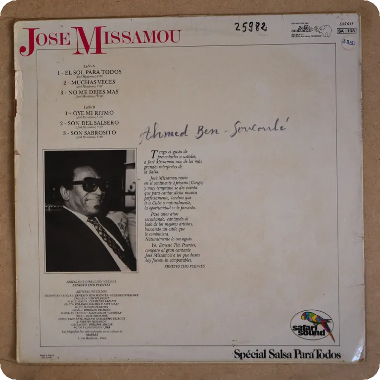 Certainly his best LP along with the "Salsa para todos", this one has a rawer "son" sound, and still the catchy salsa flavor, "Eres la que quiero" has latin jazz approach, quite unusual in the African discography. sleeve with some wear, transparent tape along top & bottom, stains and discolouration along mouth on back, mini peel off & writings & dirt on labels, record plays w/ quite reasonable to hardly noticeable noise from marks, VG- to solid VG depending on parts.
