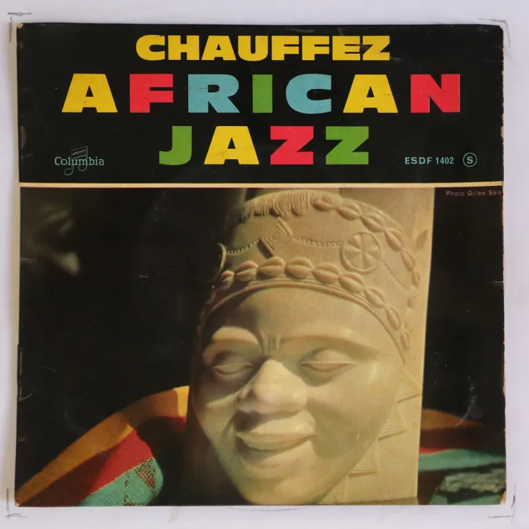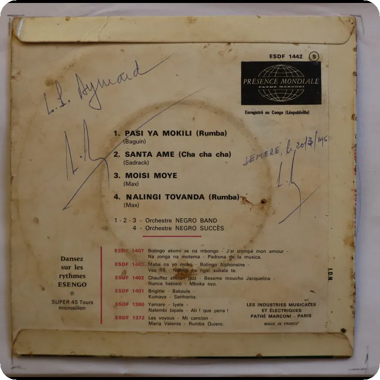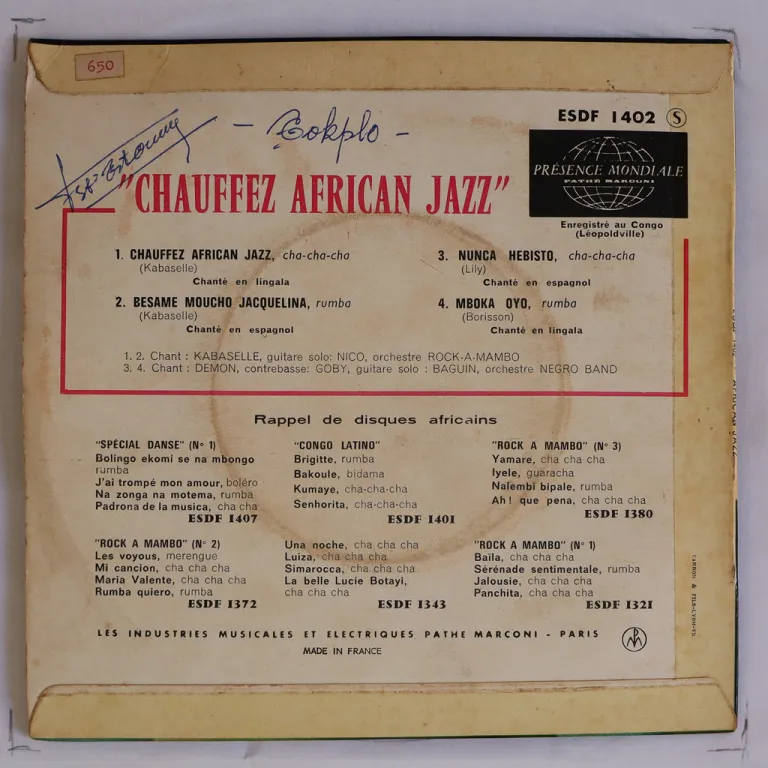 Cuban influenced Congolese cha cha cha & rumbas, aging & dirt wear on cover, writings & ringwear on bac, writings & sticker on labels, noisy from marks, a bit shaky on edges from heat damage warp