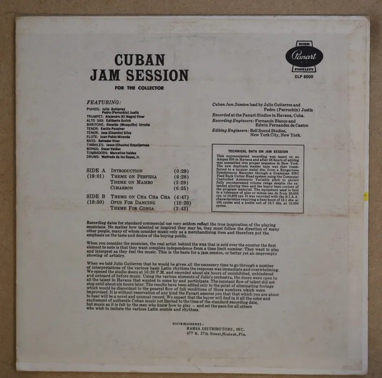 Latin jazz descarga on top, also solid guaracha & montuno w/ Jose Chombo Silva, El Negro Vivar, Emilio Penalver, Perruchin. 1970's royal blue label Ramsa distributors repress. Minor wear on cover, dirt on back. Record has light to hardly noticeable pressing noise and is in top shape.