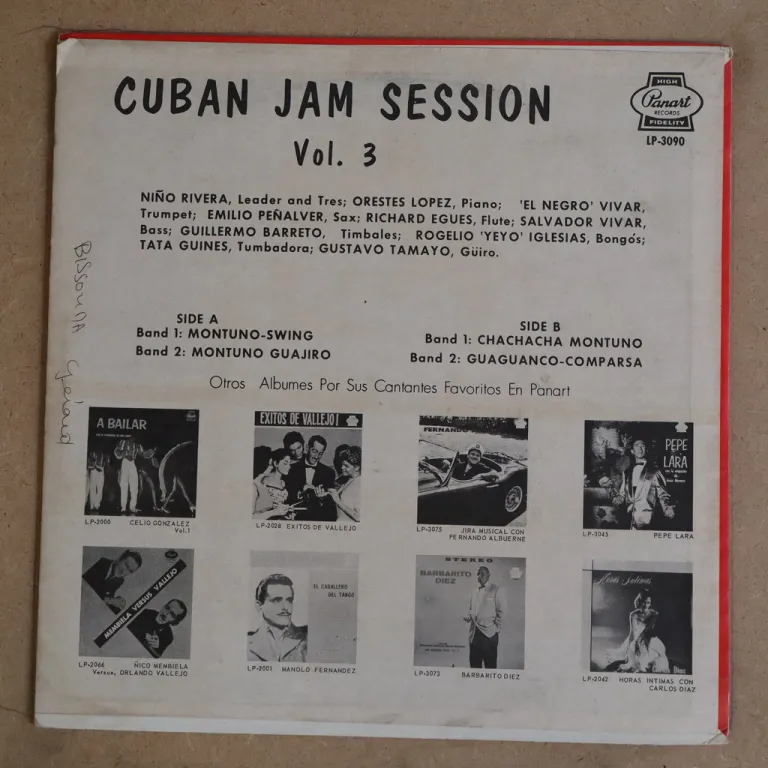 Latin jazz / descarga track, featuring no one else but El Negro Vivar, Guillermo Barretto, Tata Guines, Orestes Lopez. The cream of the crop of Habana's jazz scene of the 50's & 60's. Pale blue label without deep groove. Sleeve has very light wear, few small stains on top front, writings on cover & labels, record plays sweetly.