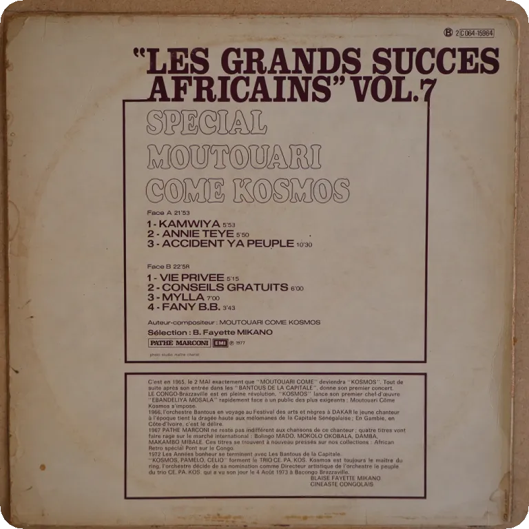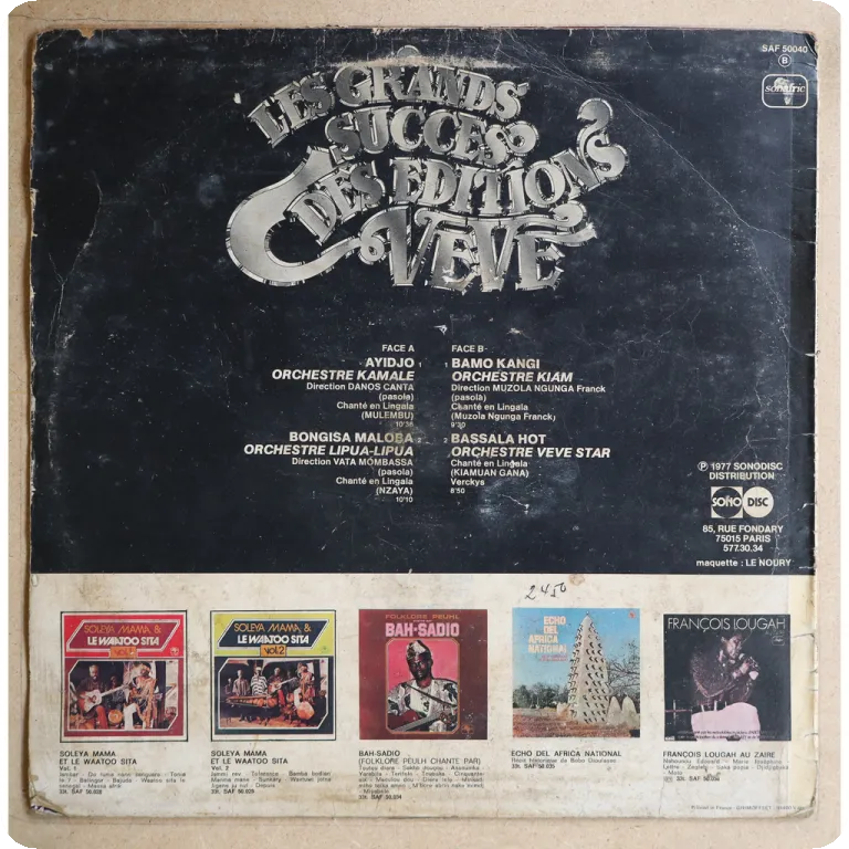 Mellow soukous & rumbas as recorded by this Congolese band on scarce Pathe relase. Some wear on cover, bump on mouth, shop sticker on front. Record has light to hardly noticeable noise from marks.