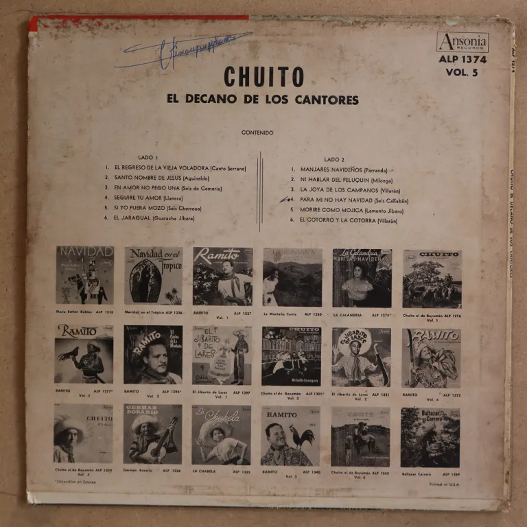 Excellent jibaro music by one of its leading figures, sleeve has dirt wear & aging, writings, small peel off & ringwear on back, record plays w/ light to hardly noticeable noise, weak to very solid VG/VG++ depending on parts