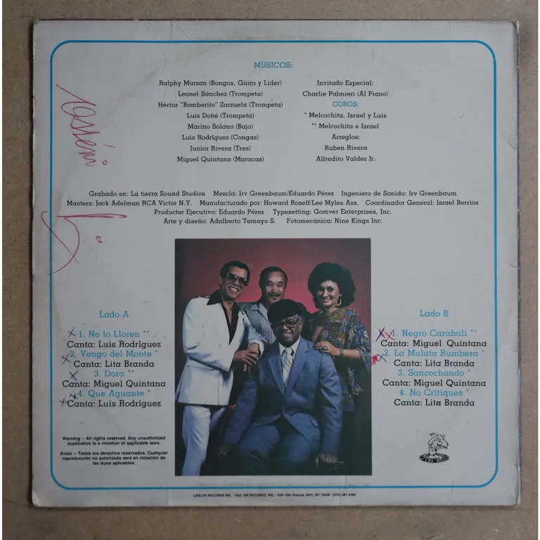 Almost every tune is a floor filler on this later consistent salsa tipica LP by Lita Branda, Miguel Quintana & Luis Rodriguez. Minor dirt & some aging, numerous writings on cover & labels. Very occasional very light noise.