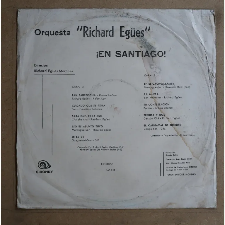 Modern bassy sones as recorded by the flute legend with his band, strong wear on cover, large light brown water damage on 1/4th of cover, 10" split on top, record has light to hardly noticeable noise only from few marks most of the time, solid VG, but a deeper and visible mark causes clicks on half of B 5 El carnaval de Oriente, a bite on edge to the vinyl but furtunately it didn't reach the grooves.