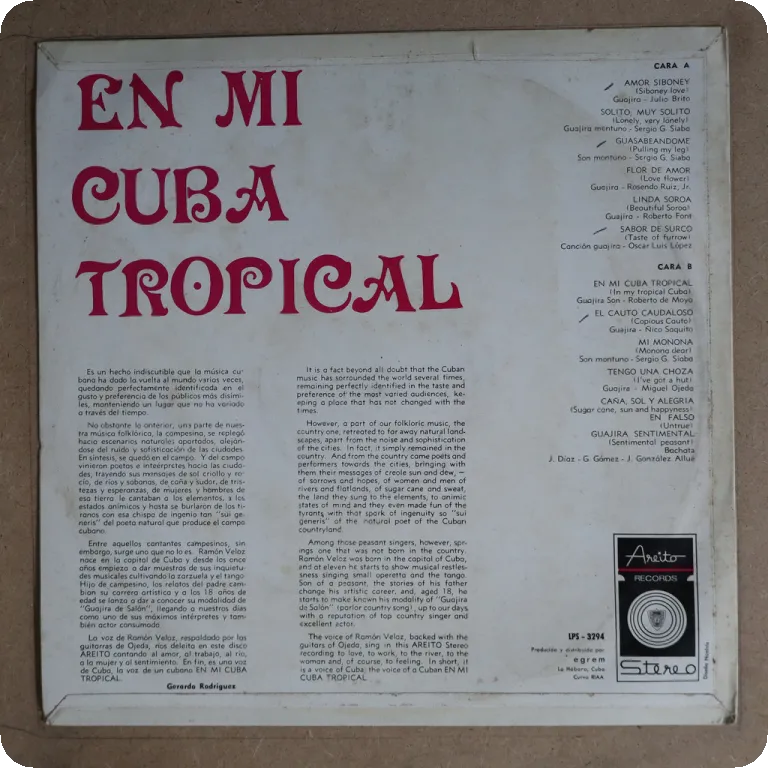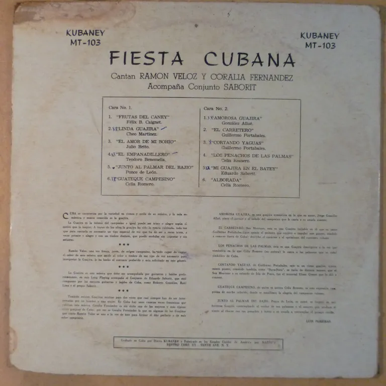 Sones, guajiras & boleros on top w/ backing by guitar led Conjunto Saborit. Sleeve has aging & dirt, 10" split on bottom, peel off & 2,5" split & tear on top seam & top front towards mouth, glue residue on front, record has reasonable to light noise from both marks & unremoveable dirt. Record has light to hardly noticeable noise from light marks & unremoveable dirt, very solid VG- to VG/VG+ depending on parts.