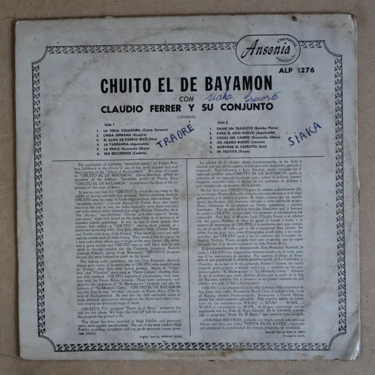 Deep & raw Jibaro Puerto Rican music masterpiece by one of the country's leading figure of the genre, includes guajiras, aguinaldos, cadena, bomba, guarachas jibaras, llanera & seis. High fiedlity Unbreakable labels so presumably the OG late 50's press. Split on all bottom, 3" split on top, writings on back & labels, dirt & aging. Record plays greatly !
