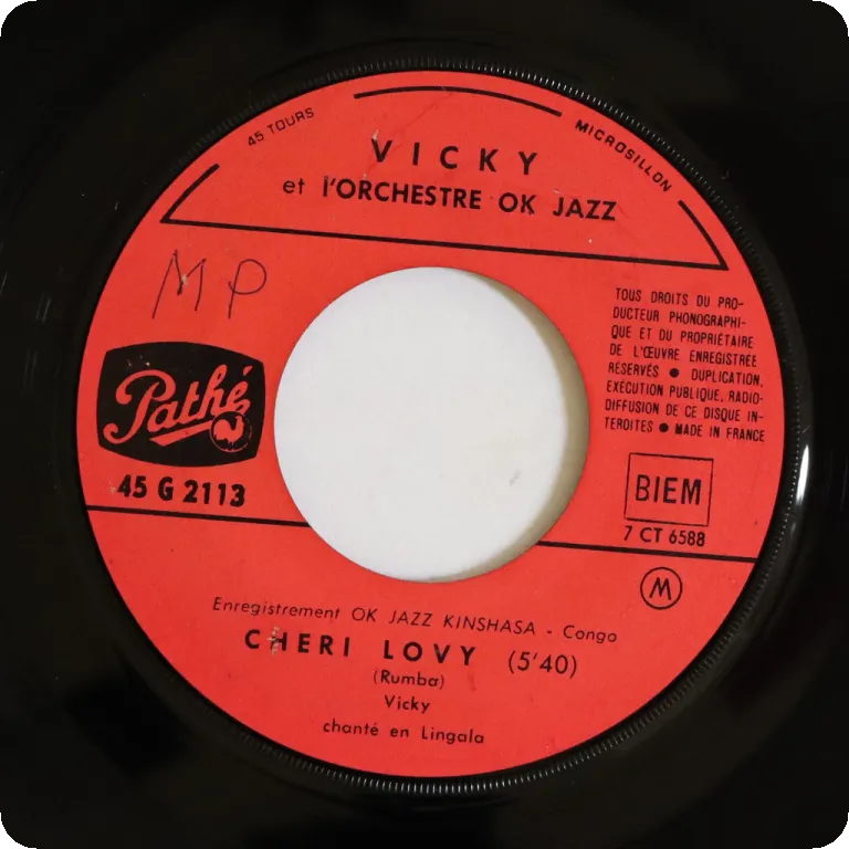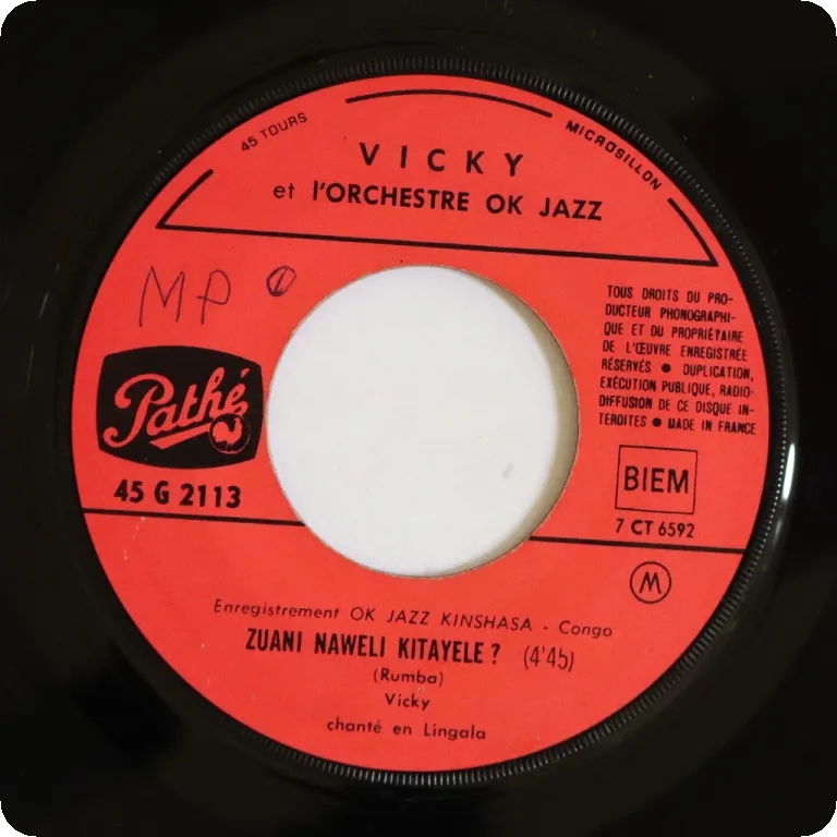 Congo rumba on top as recorded by Vicky with Franco and his legendary group on an impossible to find 7" single apprently never offered here nor on discogs. Small writings on labels. Record is VG- to