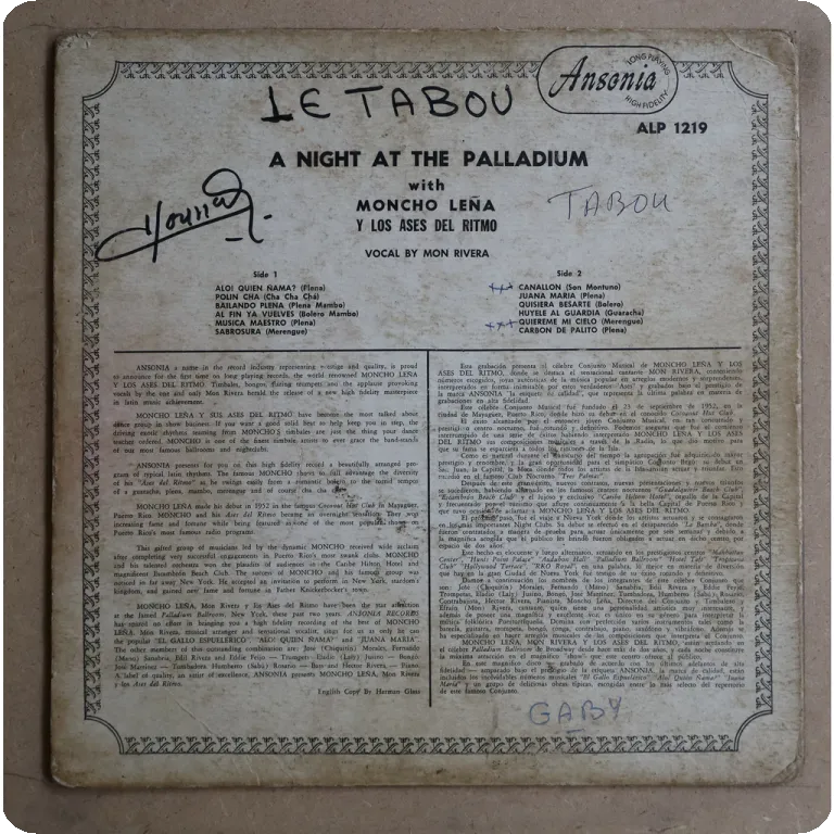 Raw sones & boleros as recorded by the Cuban legend, originally released on 78 rpm format. Sleeve has some wear, large writings on front, small ones, dirt wear & beige water damage on back, writings
