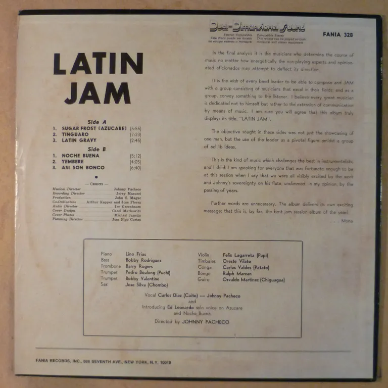 Bilongo & other winners on this classic charanga masterpiece by the flute legend. Early 70's stereo repress. Some wear, beige water amage & warp along bottom, mini writings on labels. Record in top