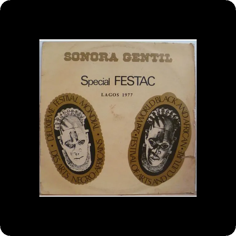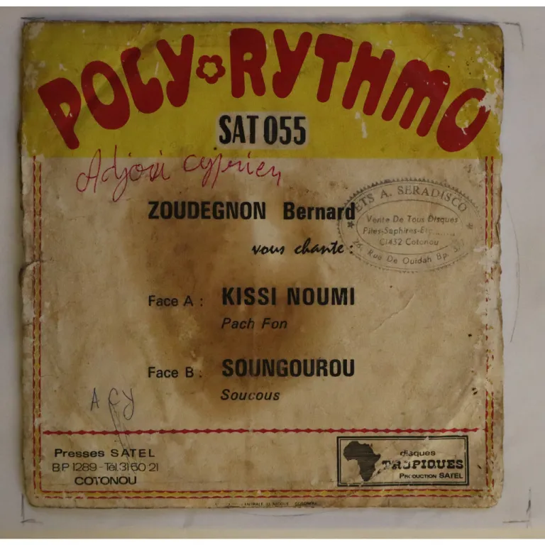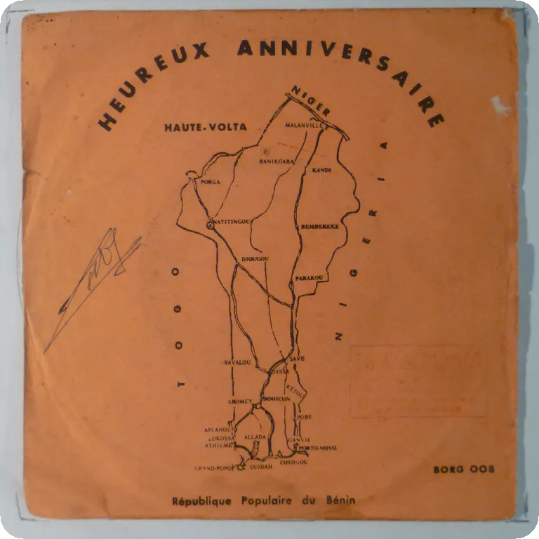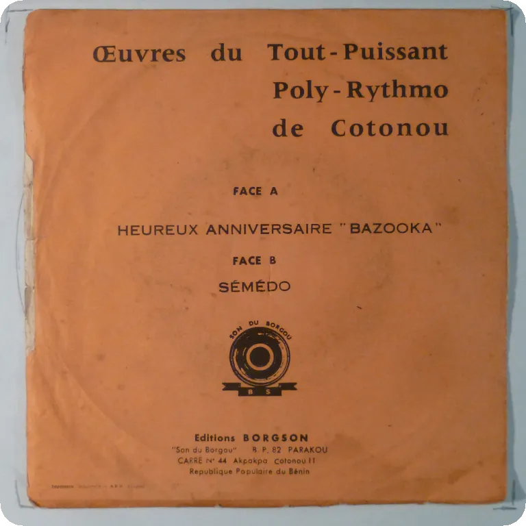 Pachanga winner tune & a soukous as recorded by the Kings of Benin on this super scarce Satel single, sleeve has strong dirt & aging, crackling & mini bites & small tears along mouth, mini bites & 2" split on spine, creases, multiple peel off, writings & shop stamp on back & writings on A label, record has strong to very reasonable noise from marks & groove wear probably from overplay.