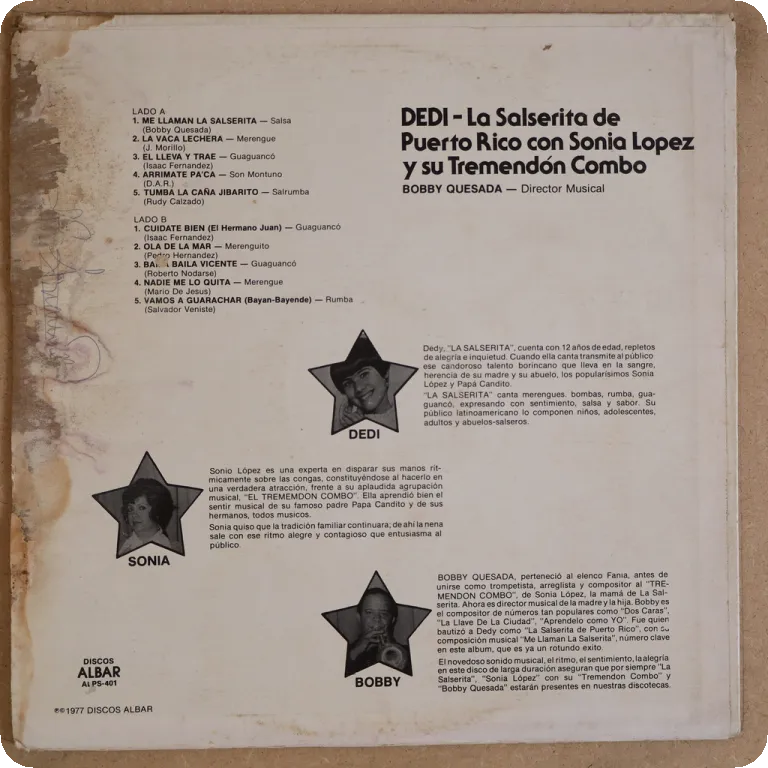 Dancefloor winners on this scarce Puerto Rican salsa lp arranged by Bobby Quesada and feat. Young 12 years old singer Dedi, sleeve w/ large peel off & beige water damage along mouth, writings on cover