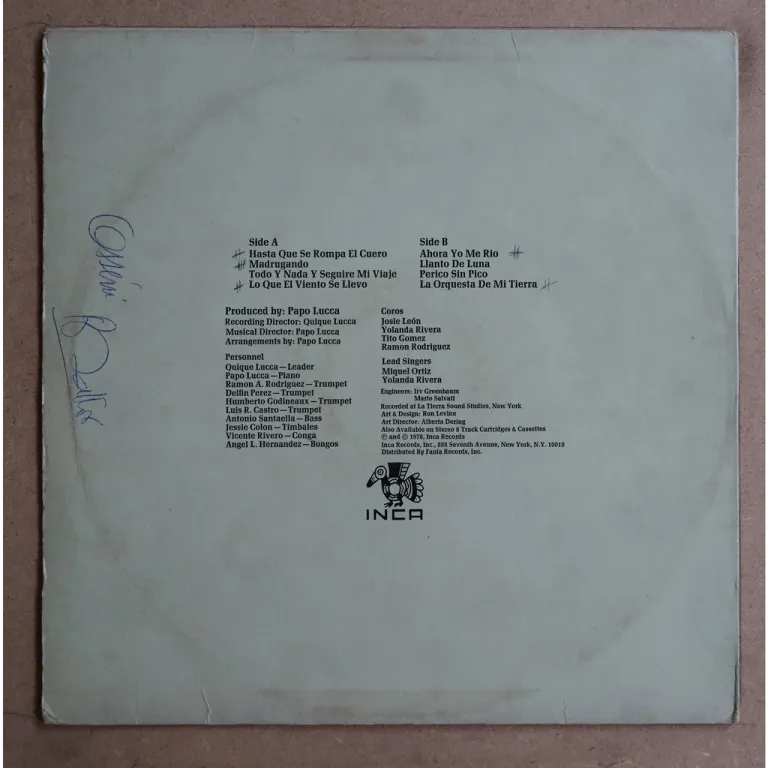 Dancefoor salsa winners on this early LP by Papo Luccca & his band, late 70's repress. Light beige water damage wear on bottom spine corner and along mouth on back, record in top shape w/ constant