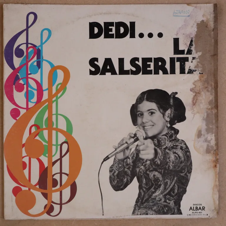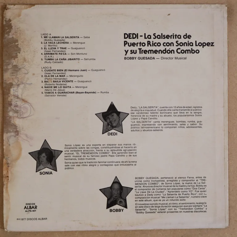 Dancefloor winners on this scarce Puerto Rican salsa lp arranged by Bobby Quesada and feat. Young 12 years old singer Dedi, sleeve w/ large peel off & beige water damage along mouth, writings on cover & labels, dirt on labels, record has light to hardly any noise, VG to VG++ depending on parts.