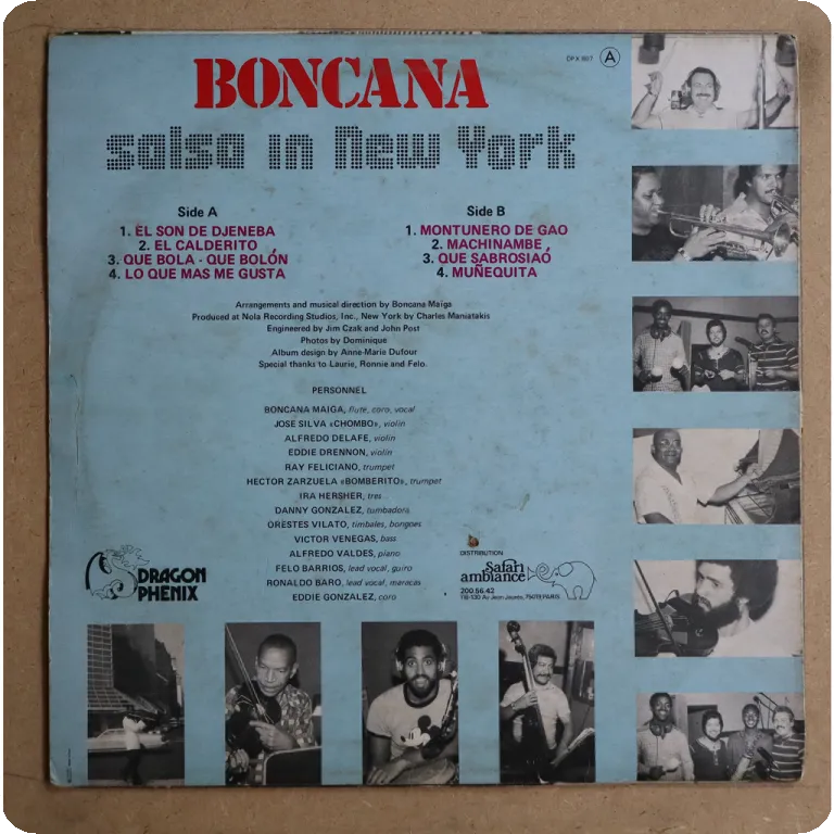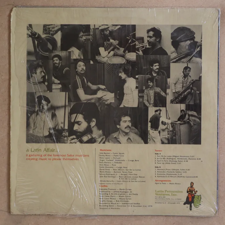 Late 70's salsa studio session w/ strong 60's descarga flavor, includes such musicians as Felo Barrios, Sonny Bravo, Rene Lopez, Nick Marrero, Alfredo de la Fe..."Manteca". Sleeve in shrink w/ some wear, small peel off on bottom mouth, narrow bite along bottom spine, large beige water damage on back, record plays with very light to hardly noticeable noise