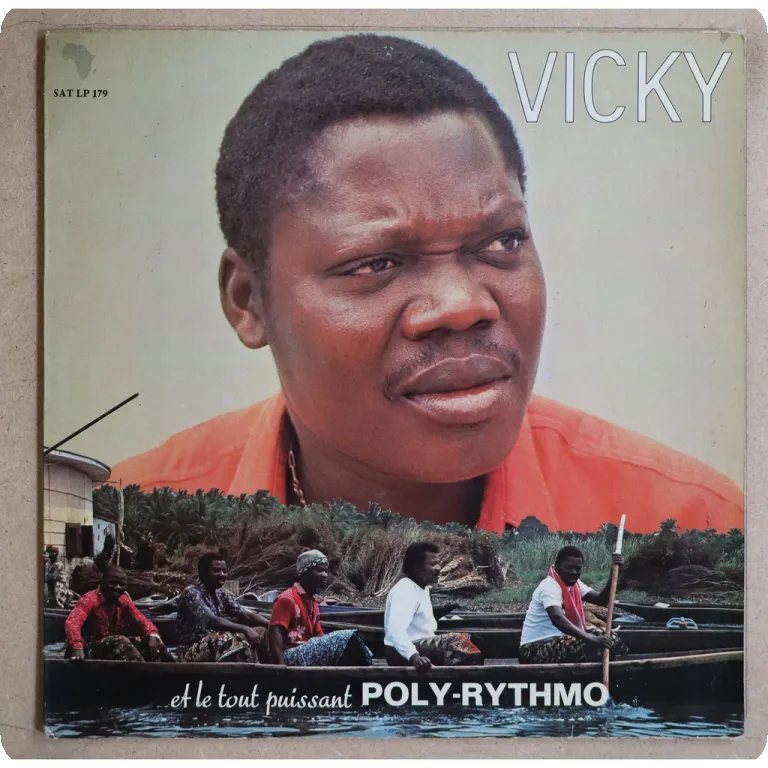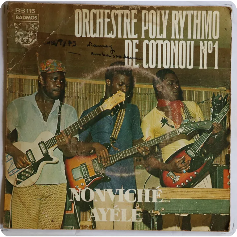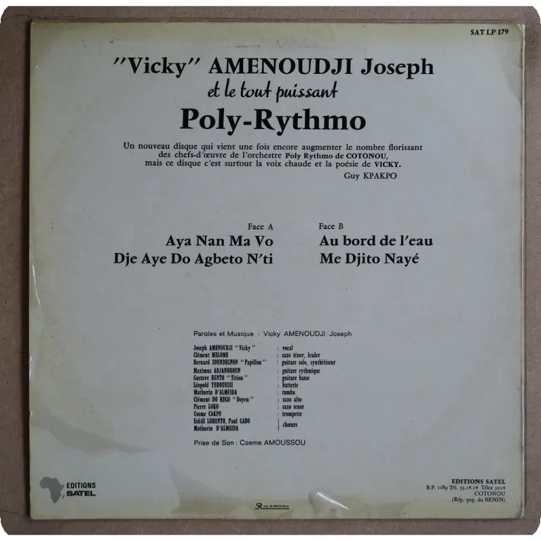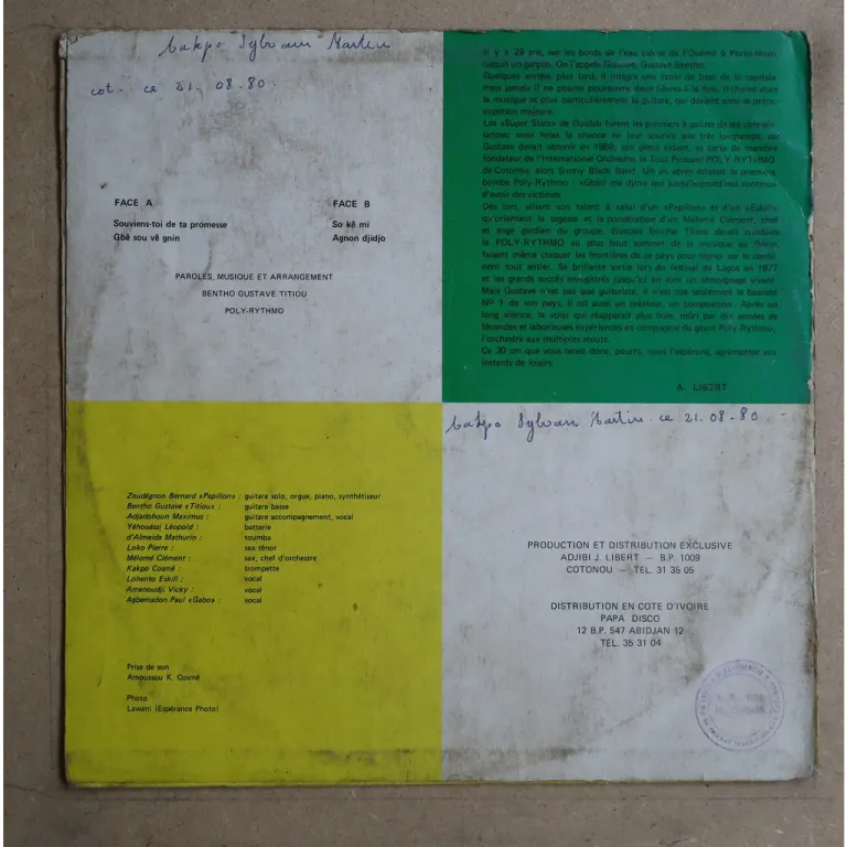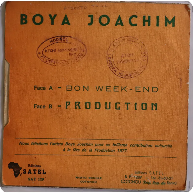 One of the best Beninese salsa tunes ever released & a 2 soukous winners on this only solo LP by Poly Rythmo bass player. Sleeve has aging, dirt, ringwear, writings, 2,5" split on spine, shop stamp on back, shop stamp & writings on labels, record plays w/ light to hardly noticeable noise depending on parts despite multiple marks, ranging from VG to VG++