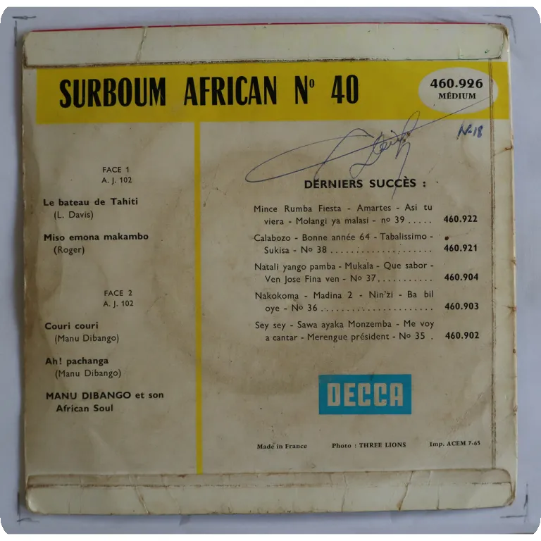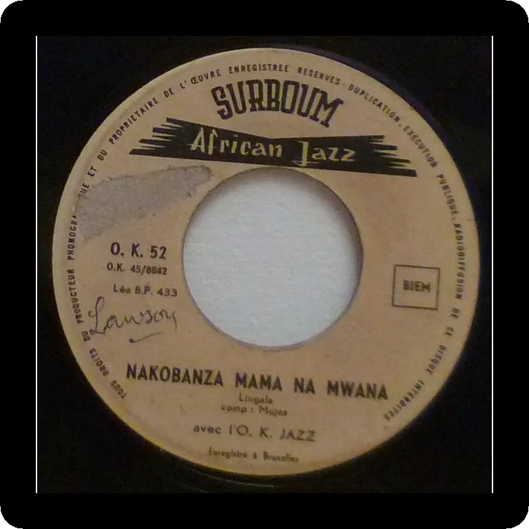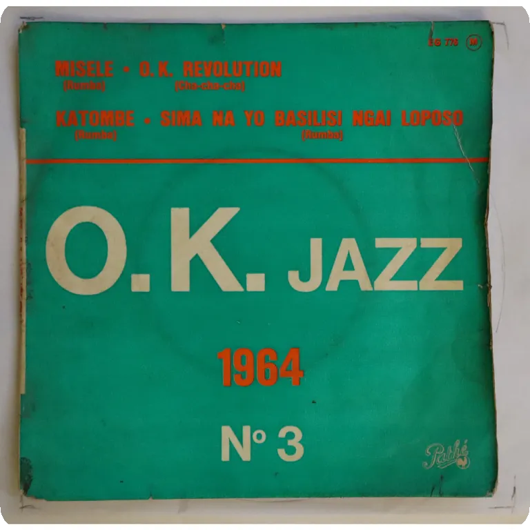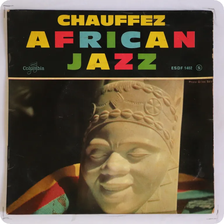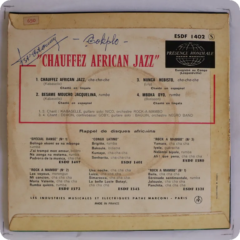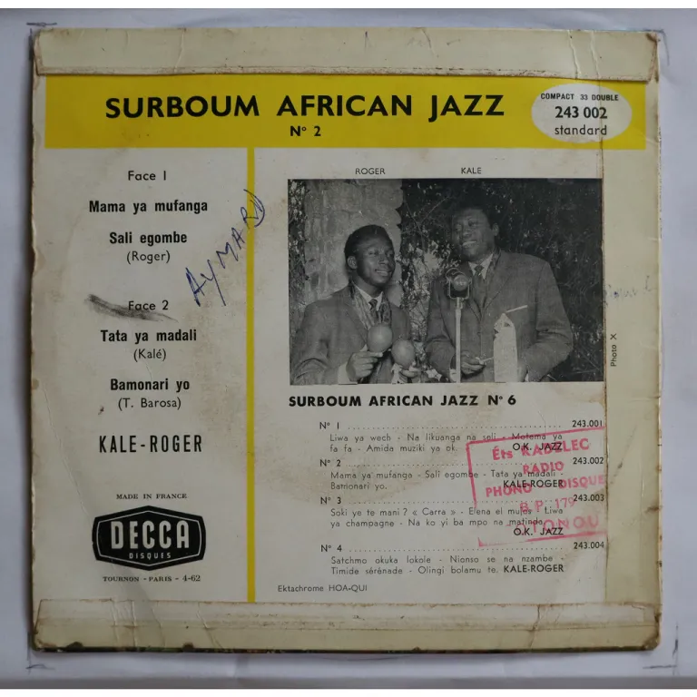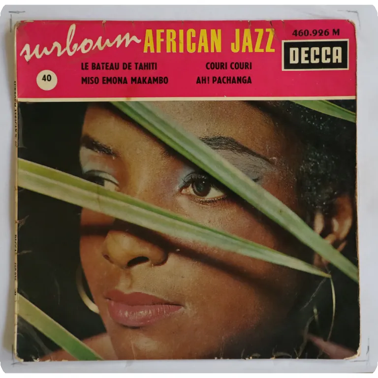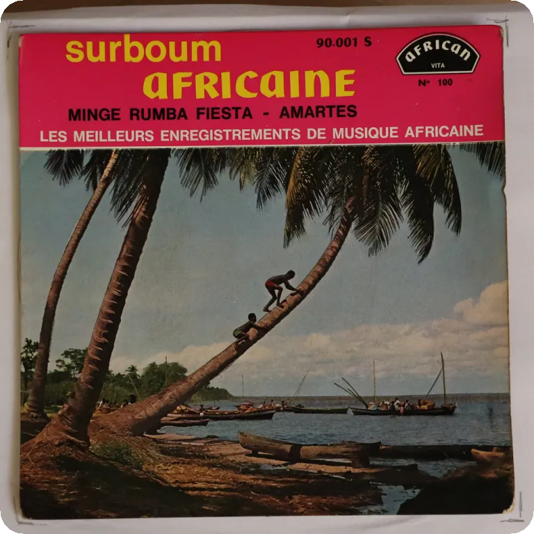 2 charming chachachas Congolese & 2 rumbas style combining two previously released scarce Surboum African jazz singles, some wear on cover, creases, shop stamp on back, writings on back & labels, peeling of the upper plastic layer on glossy cover on front, record has light to hardly noticeable noise, very solid VG- to solid VG depending on parts.