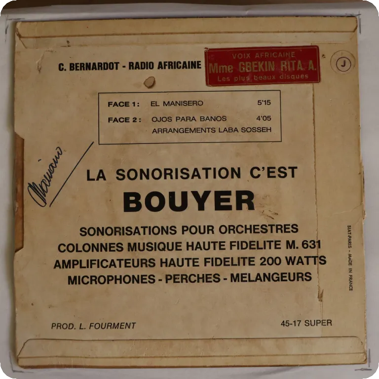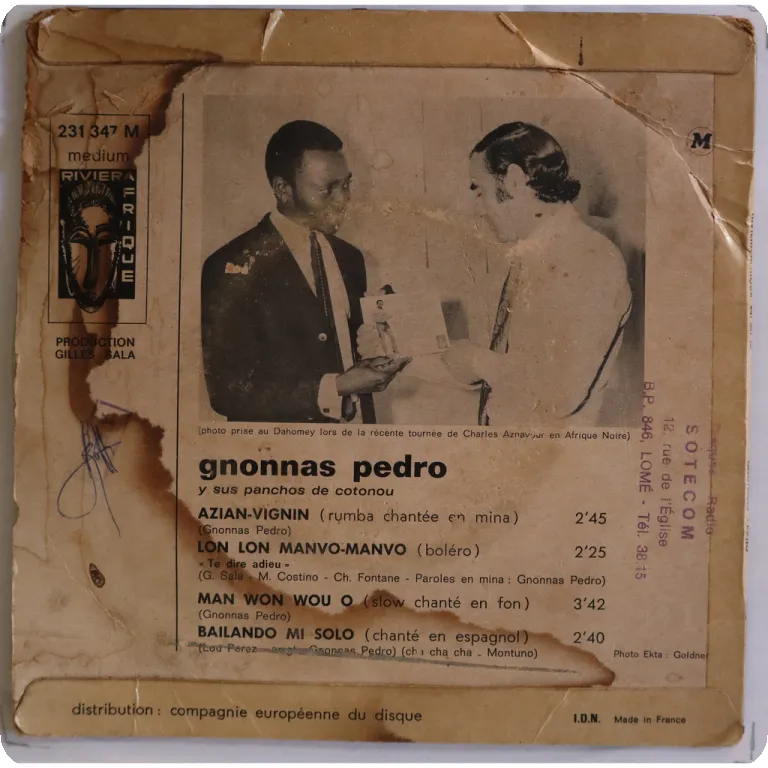 A raw son & a bolero on this super rare early recording by the Benin artist, sleeve has strong aging & dirt, writings on back & labels, 2,5 tear on top front, creases, brown water damage colouration