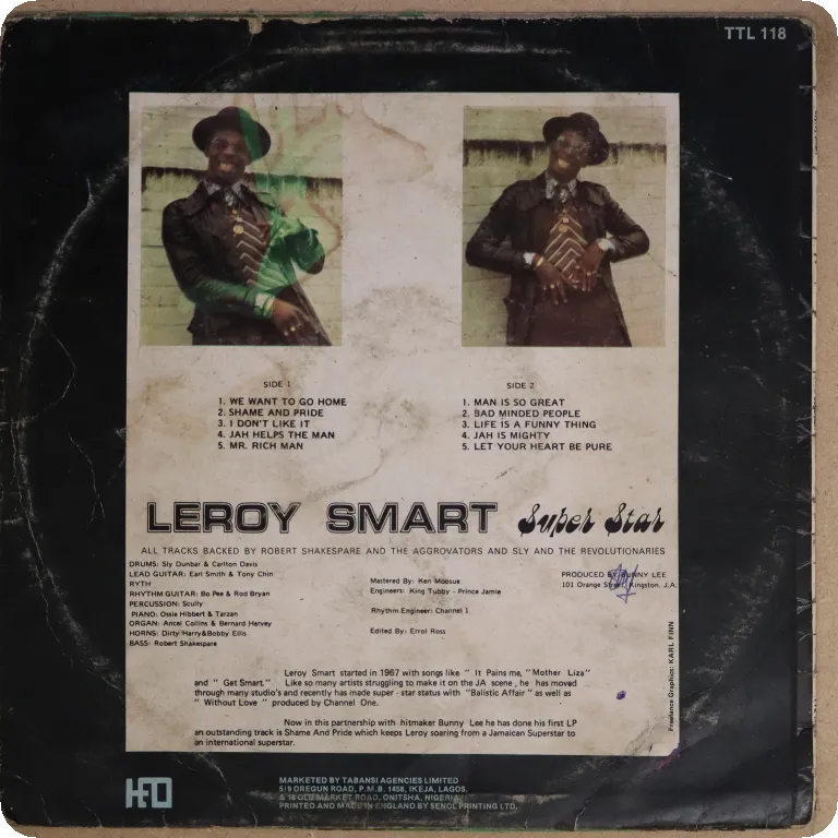 Roots reggae on top and pure happiness cover, sleeve has strong wear & aging, creases, dirt, beige water damage, small writings & ringwear on back, writings on labels, record has numerous marks &