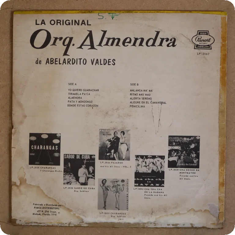 "Chacha guere" "So ! caballo ! " & more excellent pachangas. Sleeve w/ aging & wear, split along all top, 3" split on bottom, writings, air bubble & peel off on back, Record has light to hardly noticeable noise only despite some visible marks.