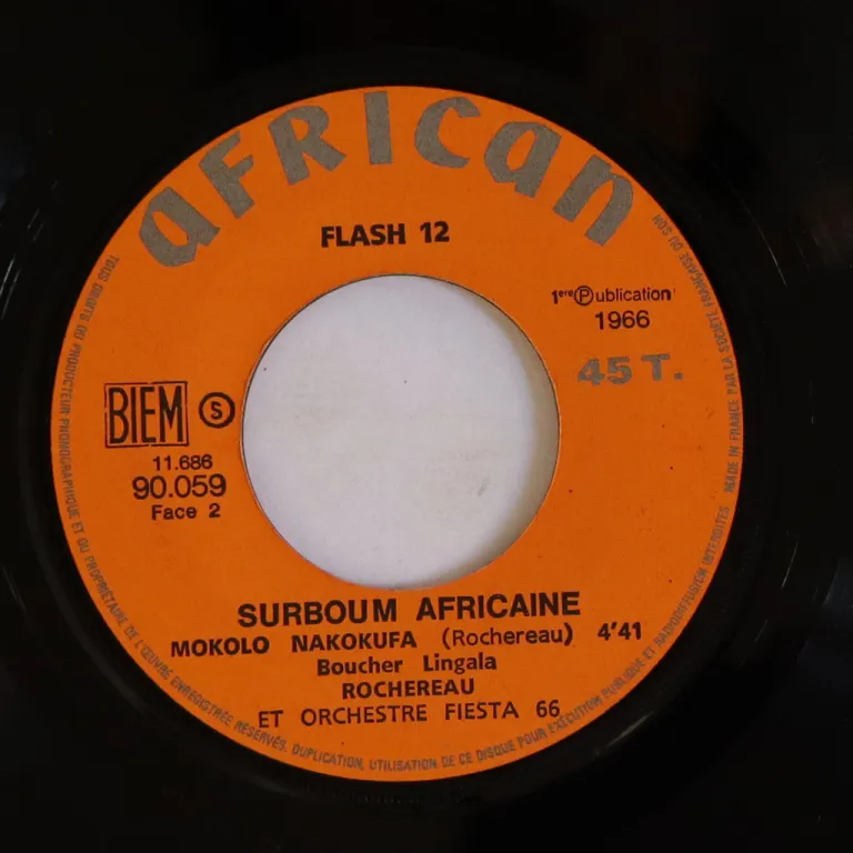 Congolese rumba sweetness double sider. Rubber stamps & writings on labels. Record plays w/ constant noise from numerous marks, solid G to VG- depending on parts.