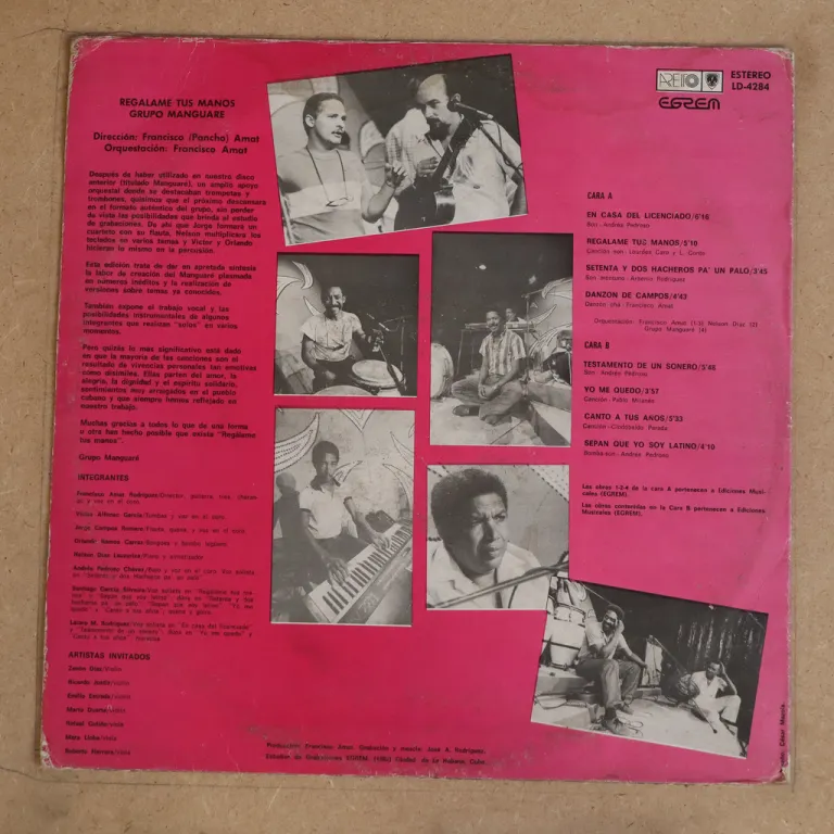 Guarachas & sones on top on this later release from Cuba, sleeve has aging & dirt, ringwear, faint red writings on front, a few dark stains on back, record plays greatly.