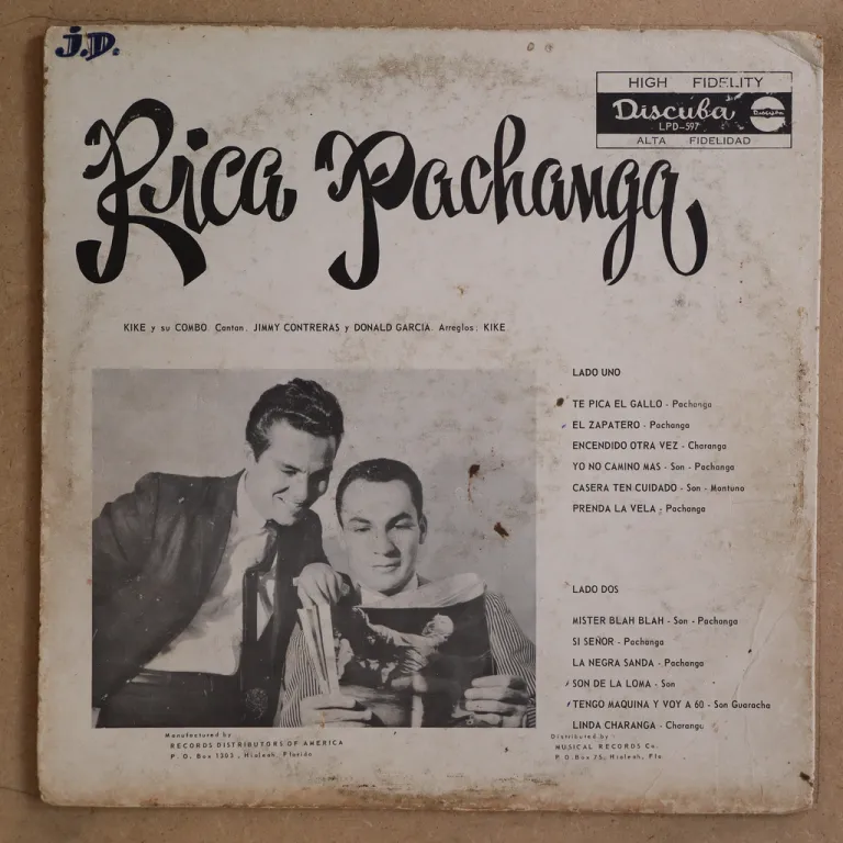 Dancefloor filler tunes, mainly pachangas & guarachas and a nice cover of Orlando Marin's Casera ten cuidado, sleeve has dirt/aging, split on all top & bottom, small peel off on top left front corner & writings back, record has very reasonable to very light noise from marks & pressing, varies from VG- to VG/VG+ depending on parts, noisier on B side (clip 1)