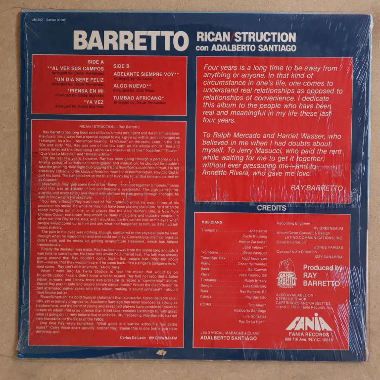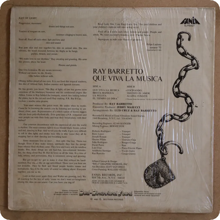 Killer latin soul, latin jazz descarga & salsa classic feat. " Viva tirado " " El raton " with unusual jazz & Afican guests Manu Dibango, Billy Cobham, Jorge Santana Gatefold. Still in OG shrink w/