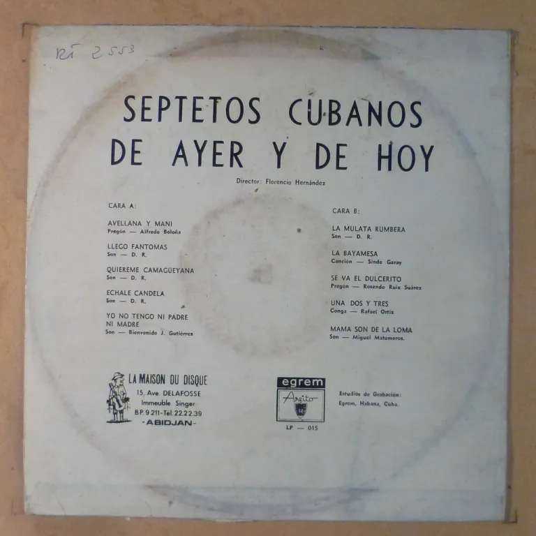 Afrocuban sones on top on this scarce compilation specially released with Areito for the African market by an Ivory Coast producer. Features possibly exclusive tracks & previously released material. Sleeve has strong ringwear , dirt wear, sticker on front, writings on back, record has unremoveable dirt but plays greatly.