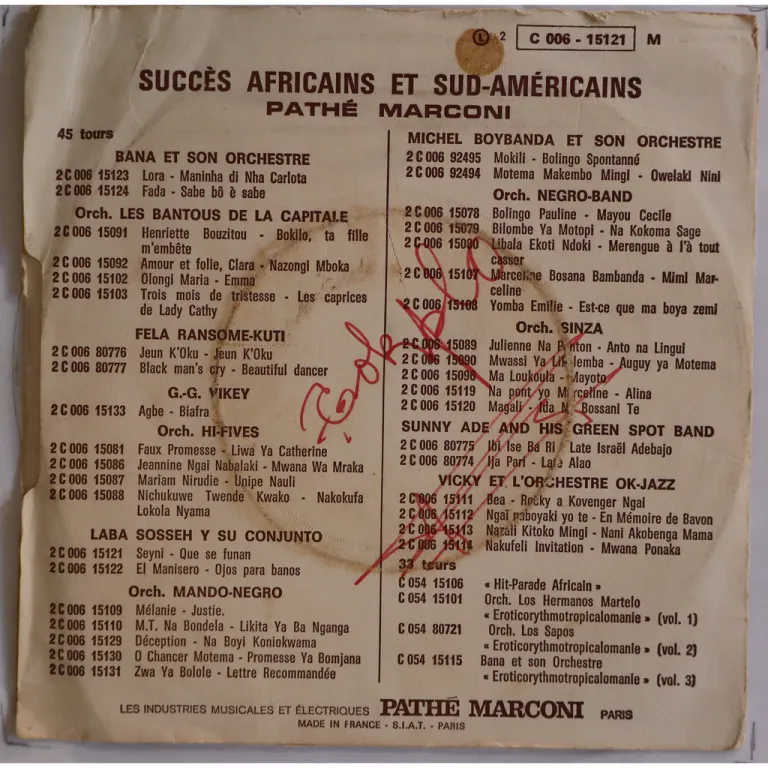 2 Cuban style montuno winners sung in wolof & Spanish by the Senegambian leader, sleeve has some aging & dirt, writings on back & A side label, record has light to very light noise from numerous light marks, very solid VG- to solid VG depending on parts.