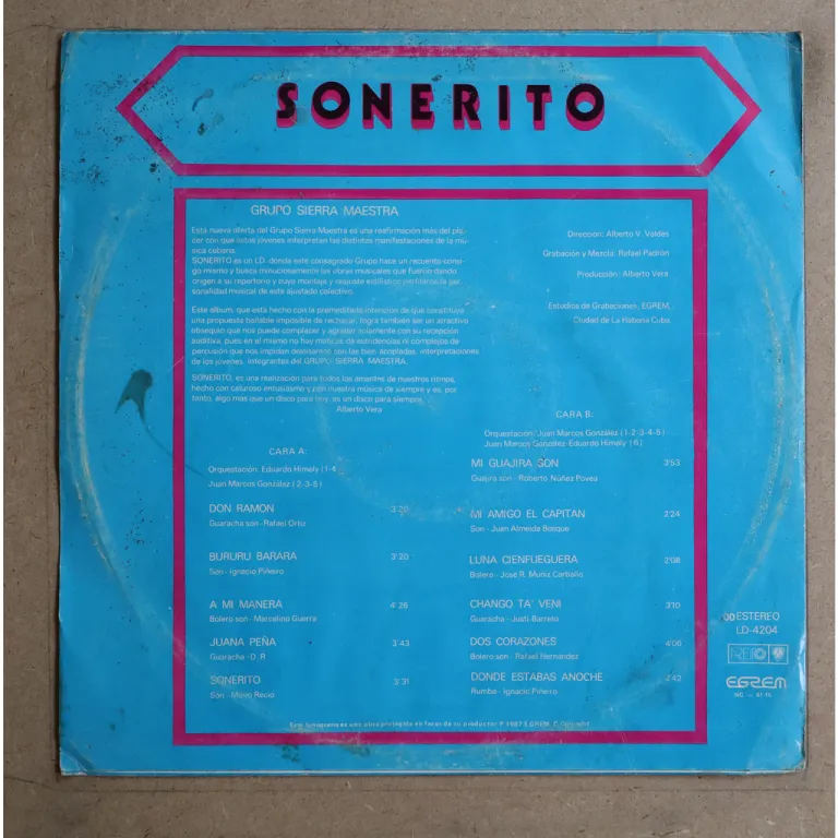 Consistent Cuban 80's salsa LP. Some dirt & aging on cover, faint red writings on front, light dirt on labels, plays greatly and looks beautiful with minor very occasional noise only, closer to EX