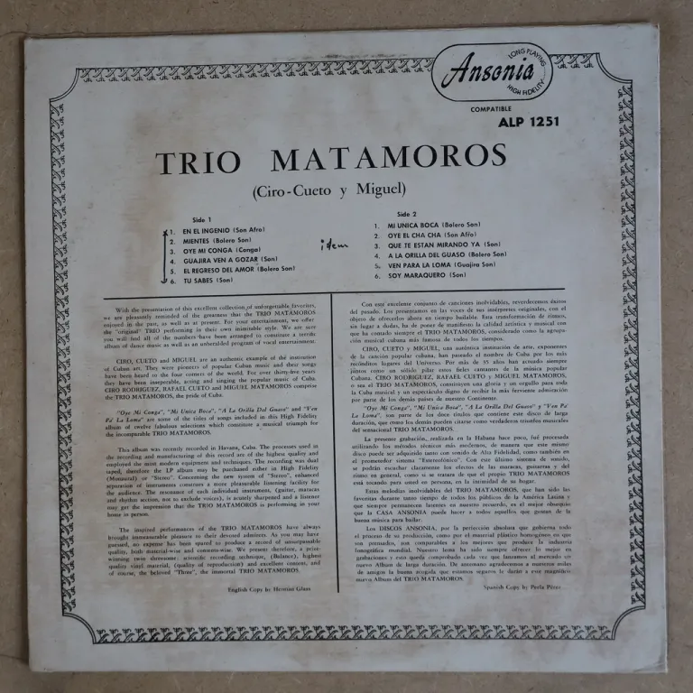Acoustic son montunos, guarachas & mainly bolero son as recorded by the legendary Cuban trio. Sleeve w/ aging & dirt, peel off & glue residues along seams & spine,