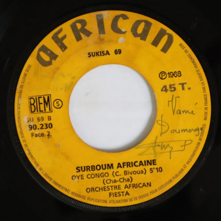 2 rumbas recorded by this renowned Congolese band for this ultra rare single only release. Large writings on labels, record has marks & constant reasonable to light noise from marks.