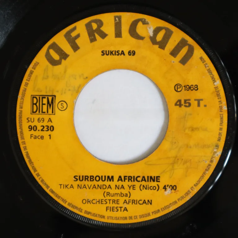Congolese rumba sweetness double sider. Rubber stamps & writings on labels. Record plays w/ constant noise from numerous marks, solid G to VG- depending on parts.
