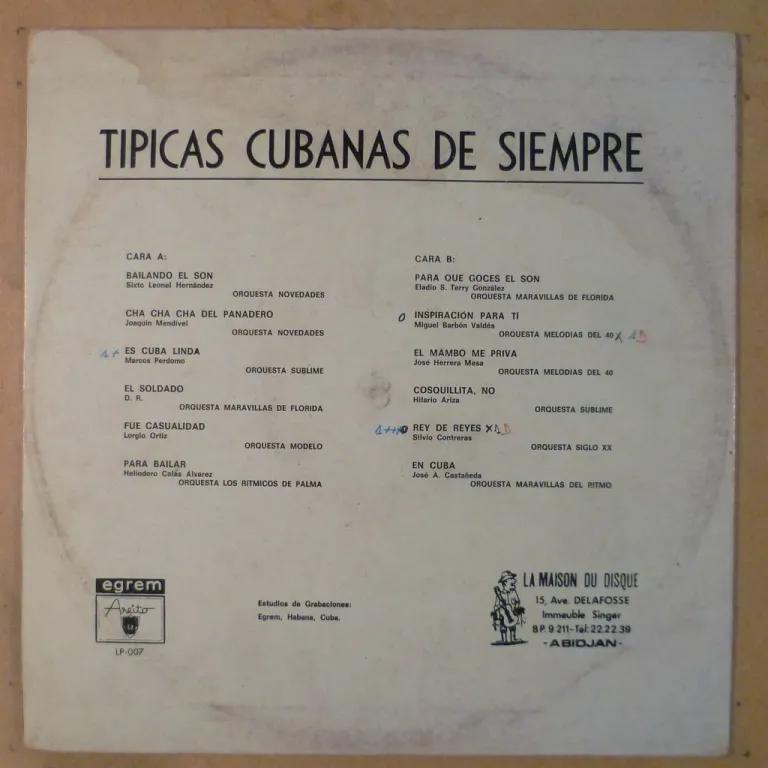 Afrocuban sounds, guarachas & charangas on top on this scarce compilation specially released with Areito for the African market by an Ivory Coast producer. Features possibly exclusive tracks & previously released material. Some aging & dirt, ringwear,light brown water damage along top. Record has very occasionally noticeable very light noise from light marks.