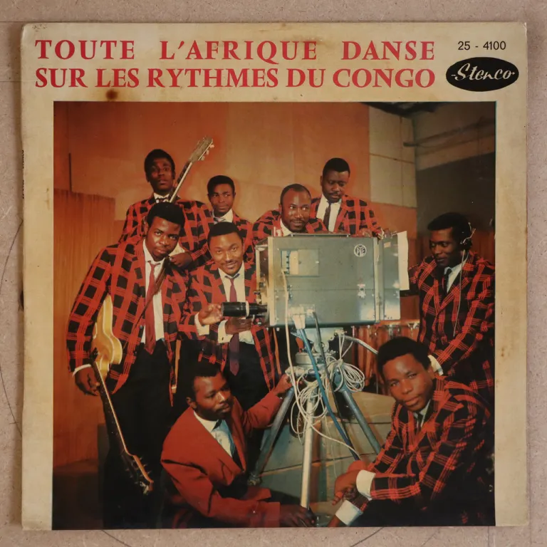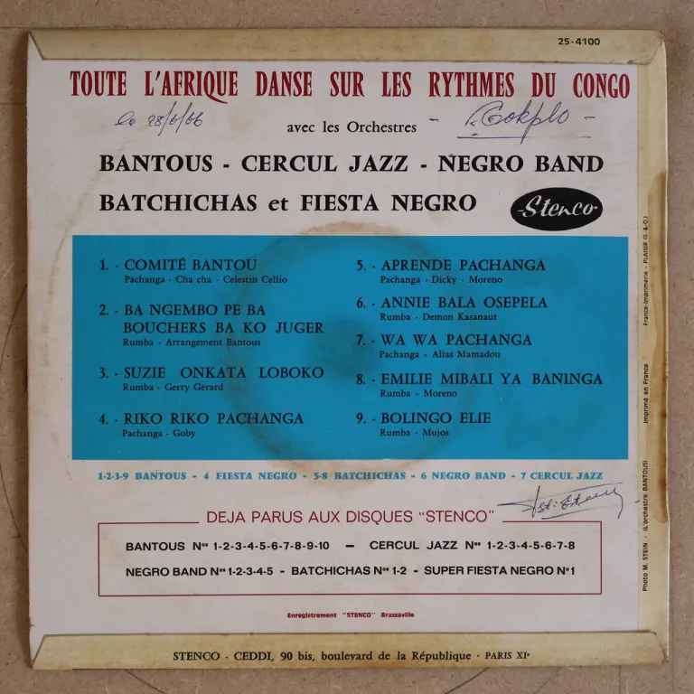 Solid Congolese pachanga tunes including the dancefloor friendly "wa wa pachanga" & "riko riko pachanga". Sleeve has dirtwear & light aging, writings on back & labels, ringwear on back, dirt on labels. Record plays really well w/ only occasional very light noise from marks.