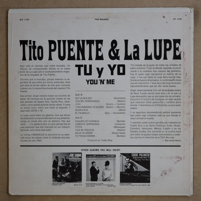 Descarga, latin jazz, guaracha & other latin rhythms on top as recorded by the unbeatable timbalero. Minor wear on cover, small writings on back. Plays greatly with few minor marks.