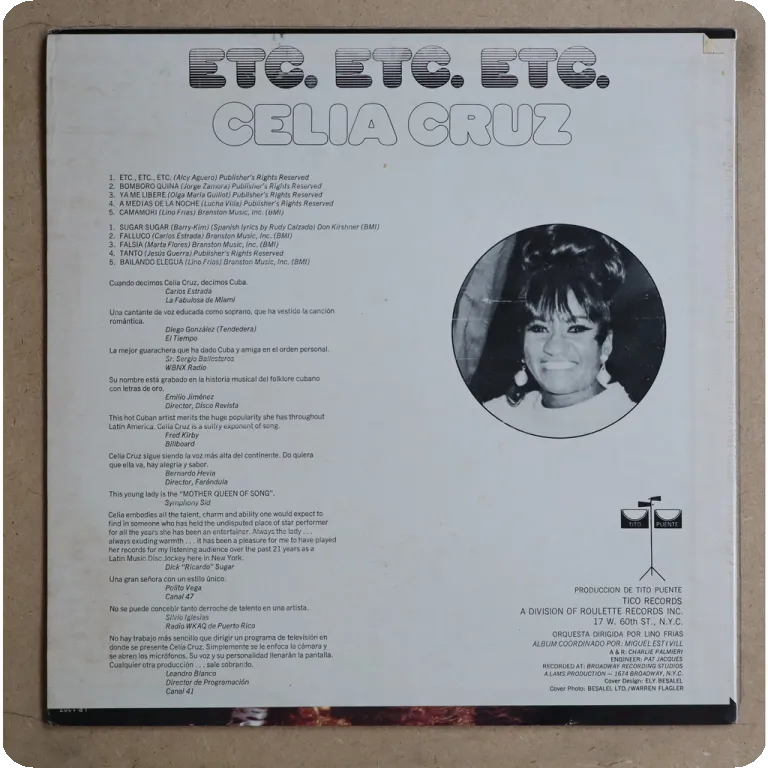 Uptempo dancefloor guaracha winners & a boogaloo on this classic by the timbalero & his muse. Mono flexi early 70's repress without address on labels. Minor wear on cover, mini writings on back &
