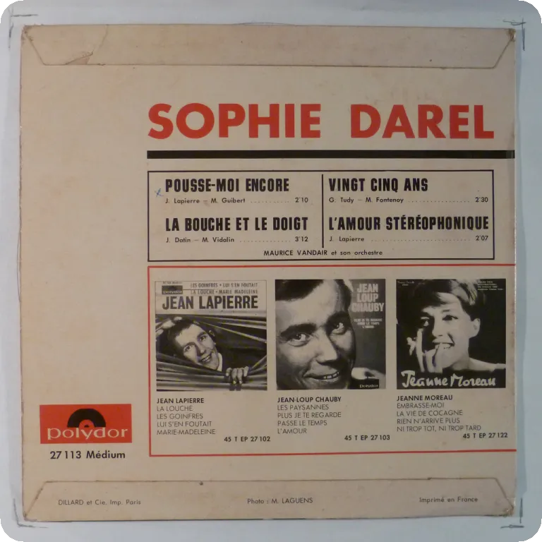 Groovy psych pop winner tune recorded by this French singer, some wear on cover, rubber stamps on cover & labels, writings on back, record plays w/ reasonable to very light noise from marks.