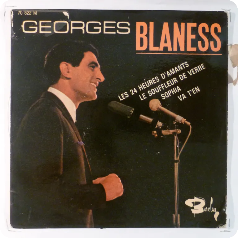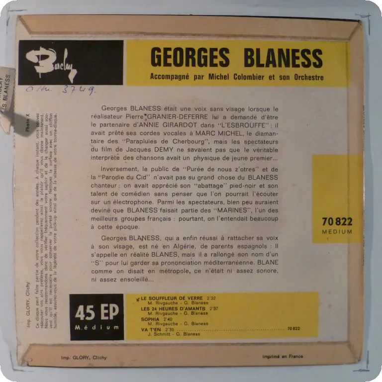 Soul ballad & vocal dixieland on top on this crooner French pop release. Dirt & aging, bite on bottom mouth, writings & ringwear on back. Record has reasonable to very light noise, crackier on the first track of each side.