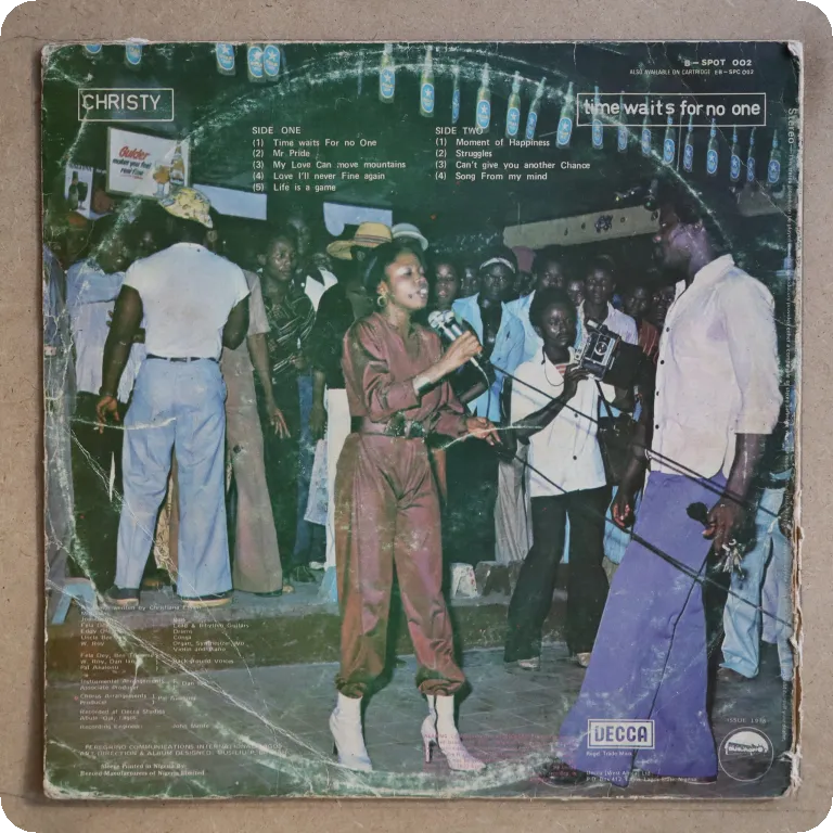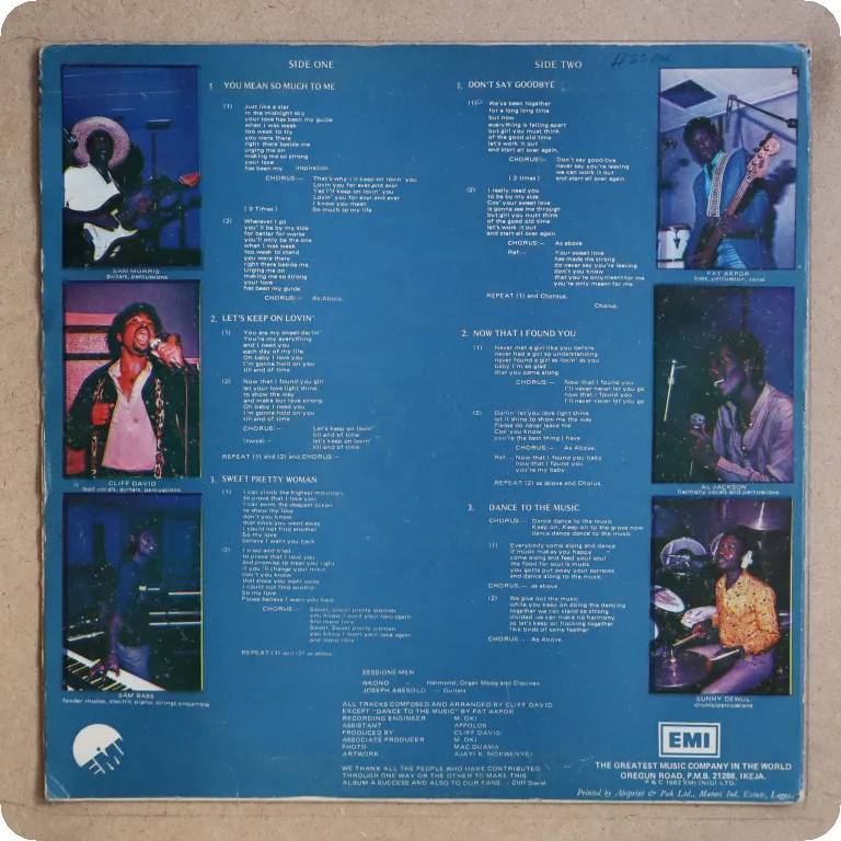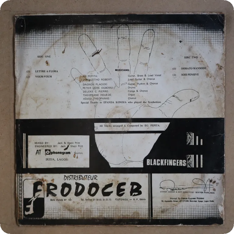 Boogie disco from Africa, self produced. Sleeve has aging & dirt wear, creases, large writings on back, large beige water damage, glue residues along top & bottom visible mainly on back, mini peel off